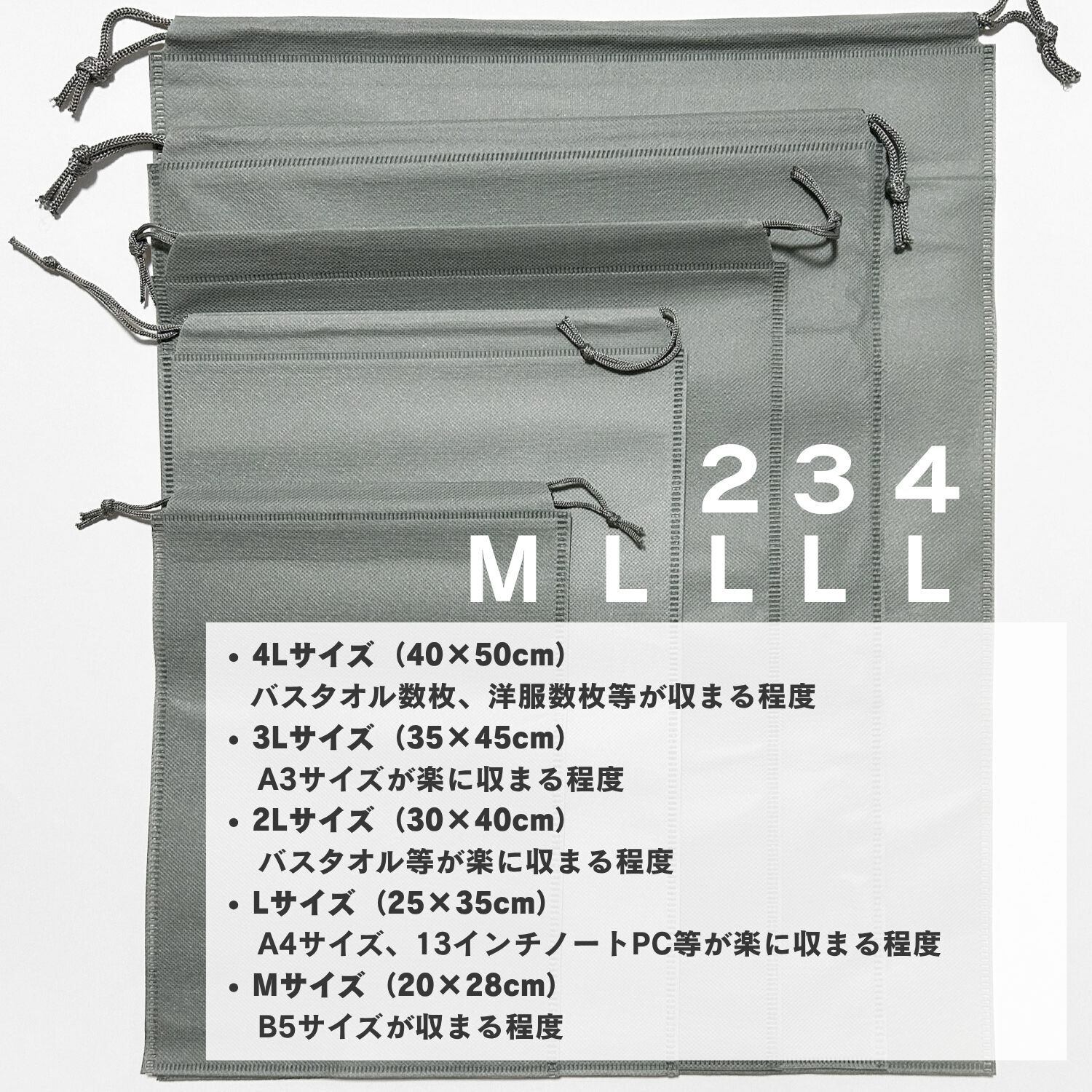 Mサイズ(20×28cm)から4Lサイズ(40×50cm)まで、バスタオル数枚が入る大きめサイズから靴下などが入る小さめサイズまで、5種類のサイズからお選びいただけます。