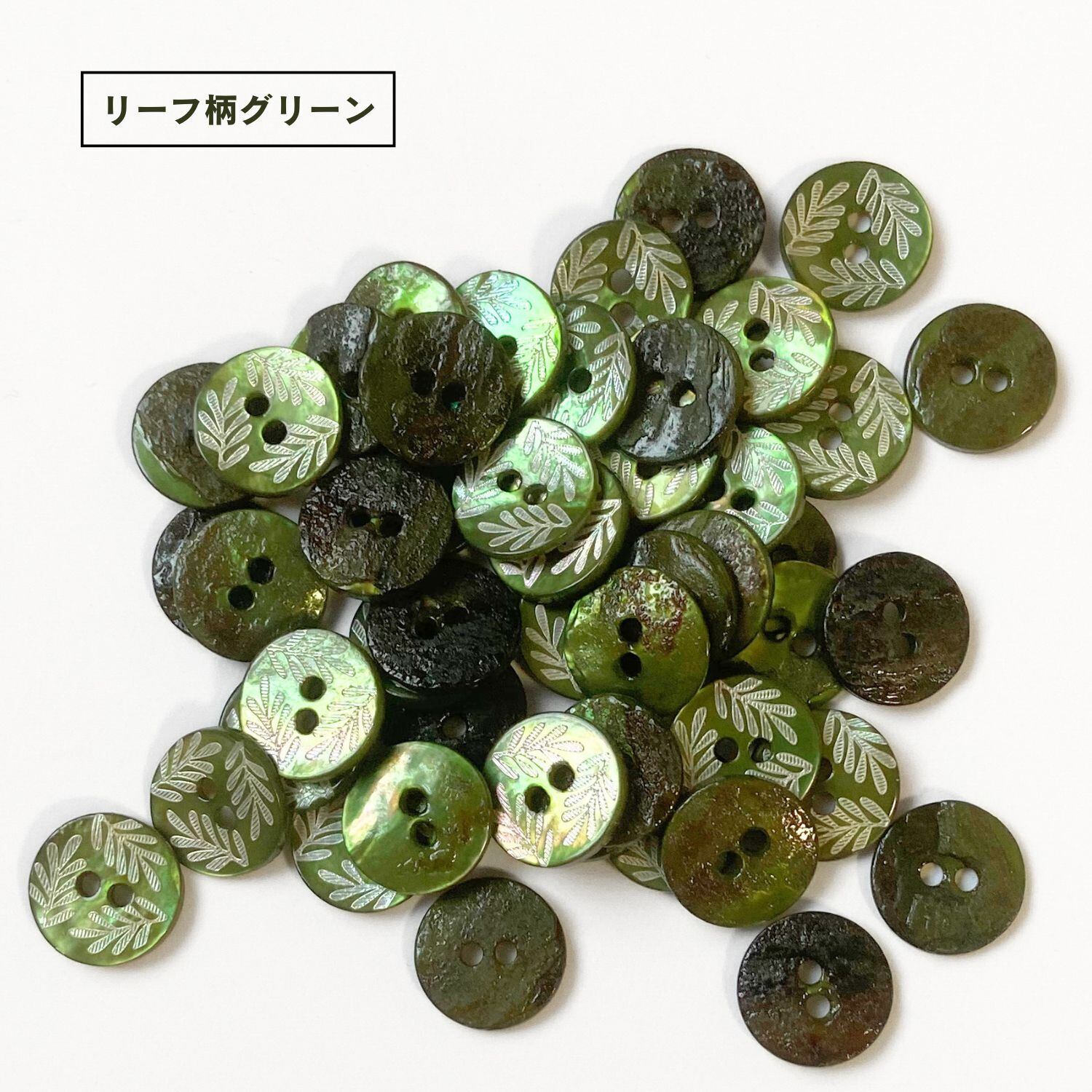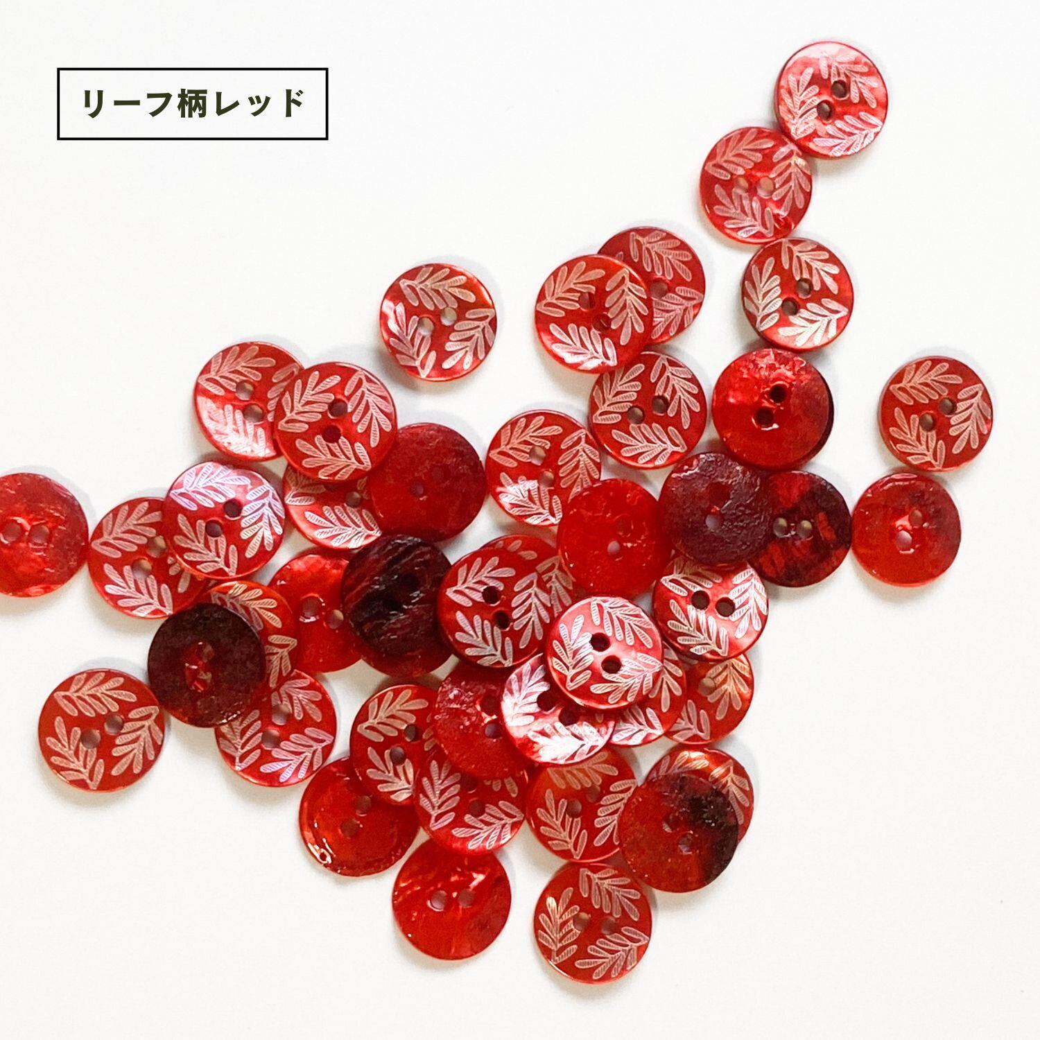 あこや貝を原材料として赤、グリーンに着色しリーフが柄を刻んだ貝ボタンです。