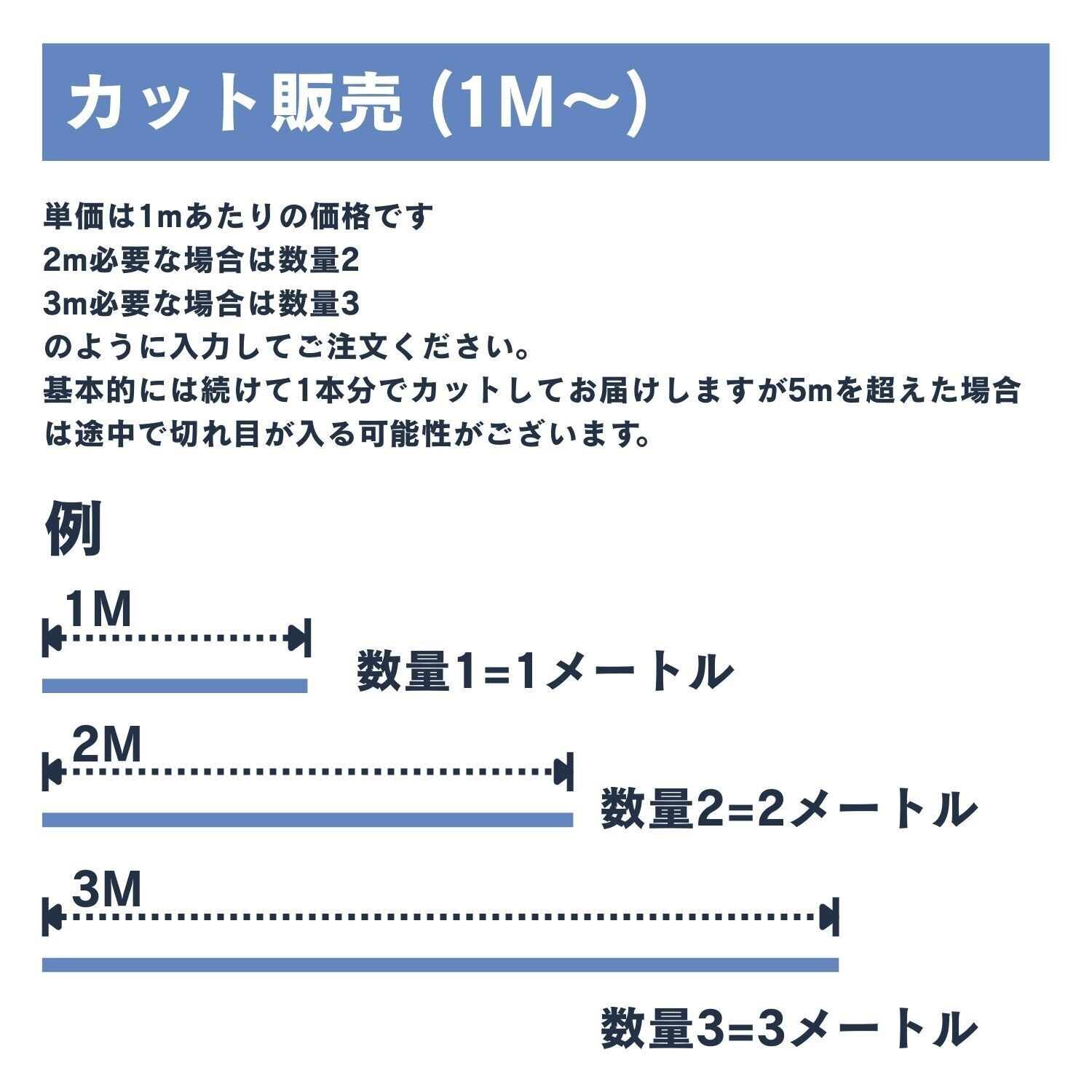 サイズ(長さ)※切り売り販売:1メートル〜(【例】 数量1=1M、数量2=2M、数量3=3M )