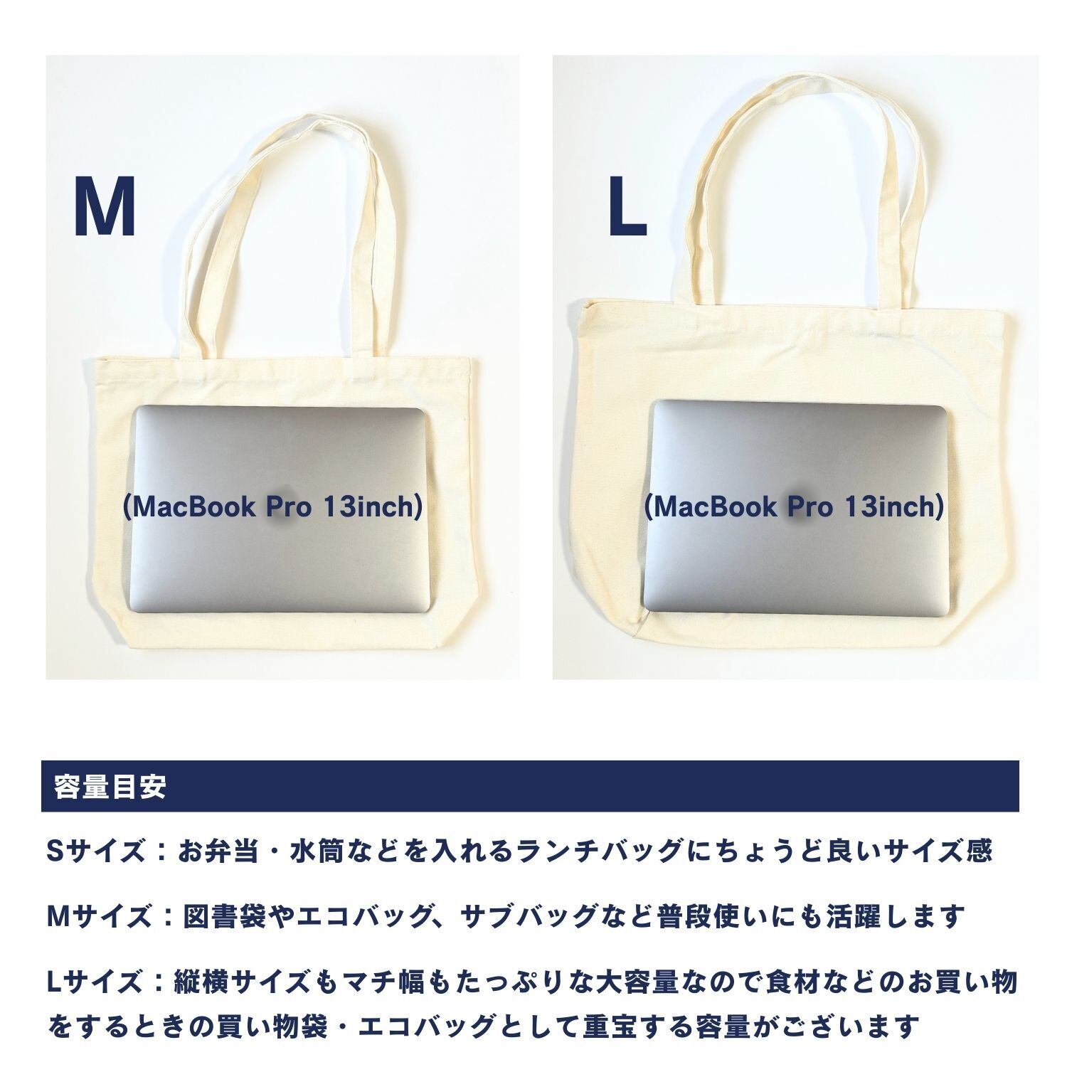 Mサイズは図書袋やエコバッグ、サブバッグなど普段使いにも活躍します。