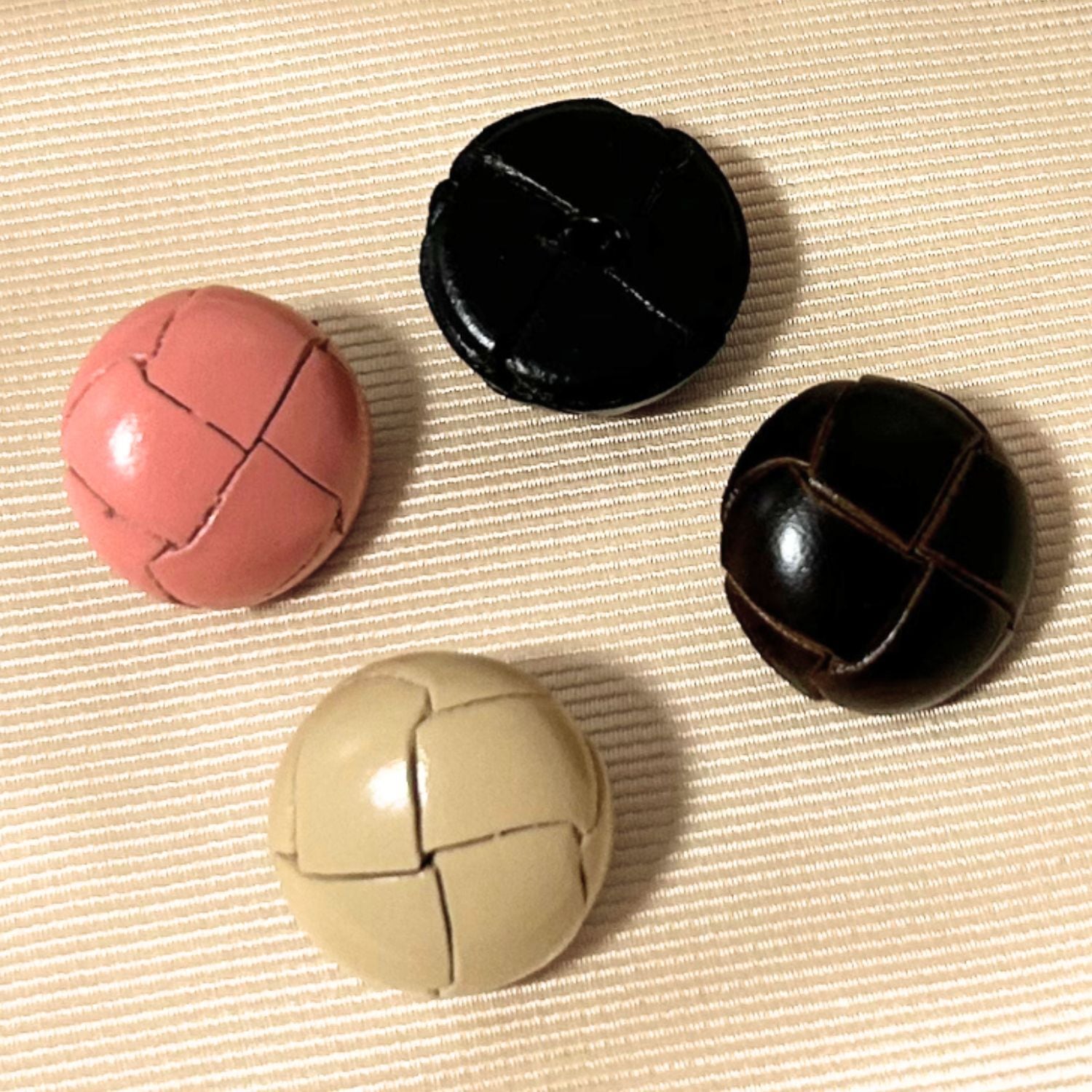 ★詳細:トップは本革くるみで根元は足つきのボタンです。表面は塗料で塗装してあります。レザーの包みボタンはよりシックで大人のお洋服にも合わせやすい雰囲気があります。