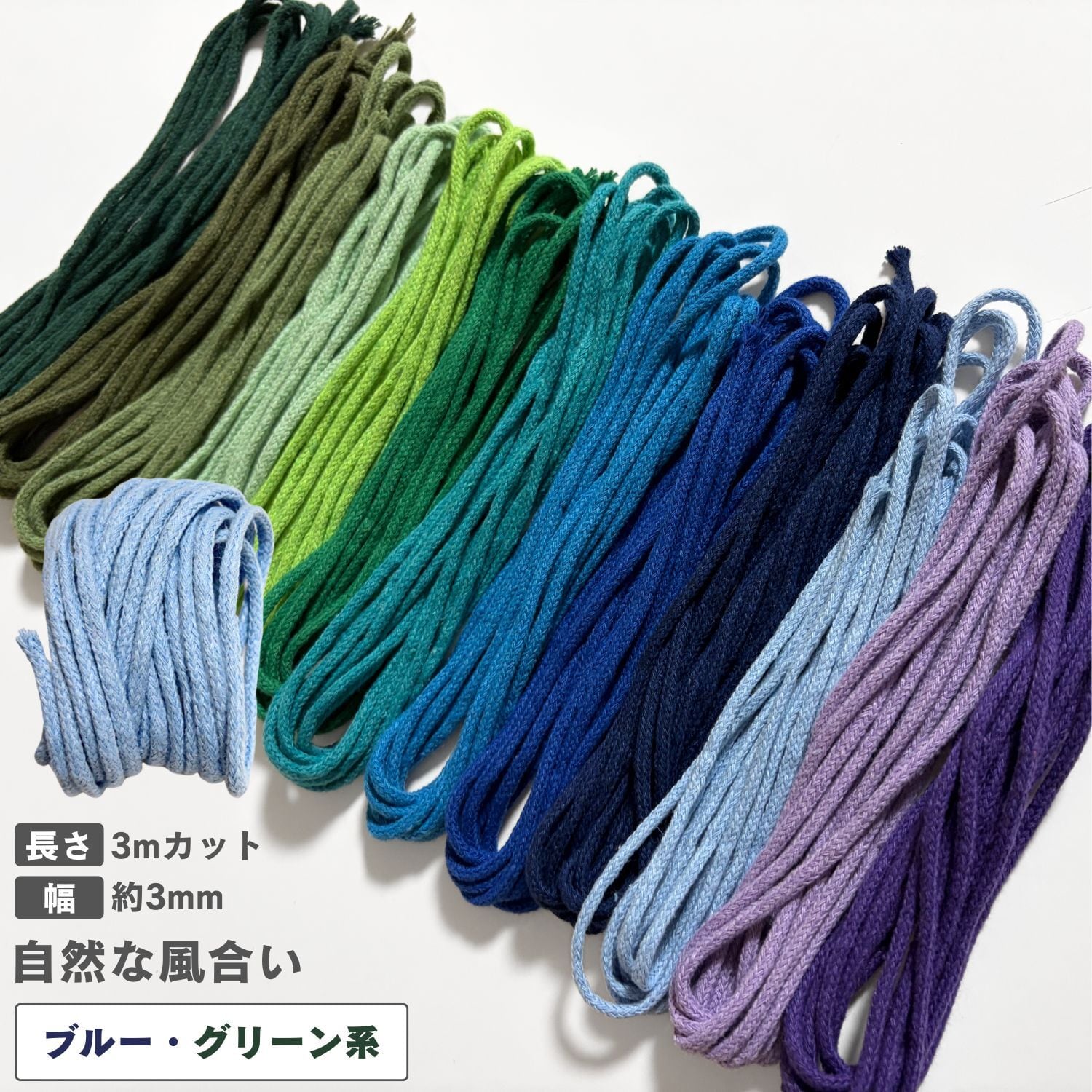 haoa 自然な風合いの丸紐 ロープ 約3mm幅 3mカット販売 綿ポリエステル混 ブルー・グリーン系