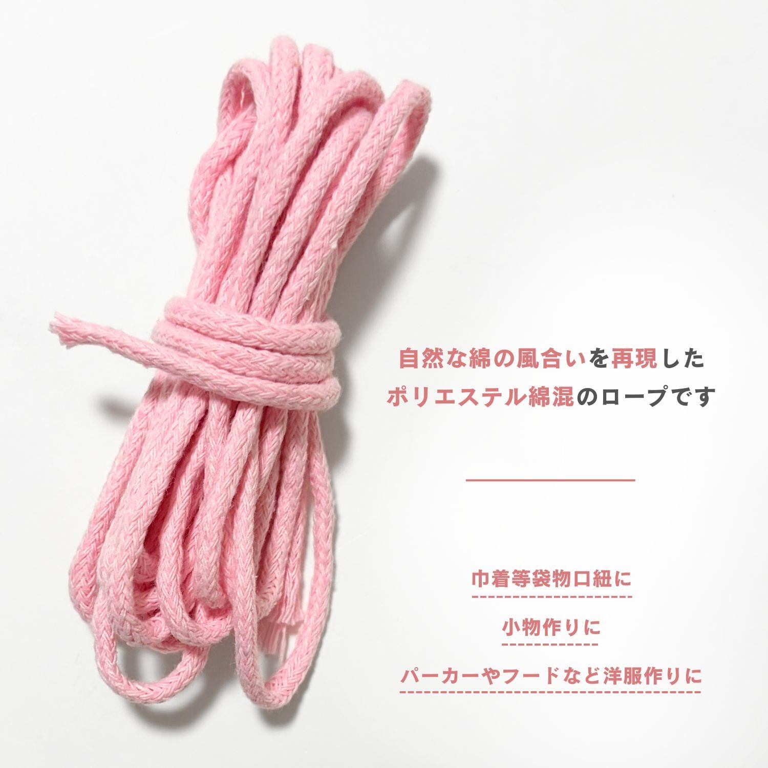 巾着等袋物口紐として、小物作りに、パーカーやフードなど洋服作りに、ぬいぐるみ服・人形服などの各種ハンドメイド材料としてご利用いただけます。
