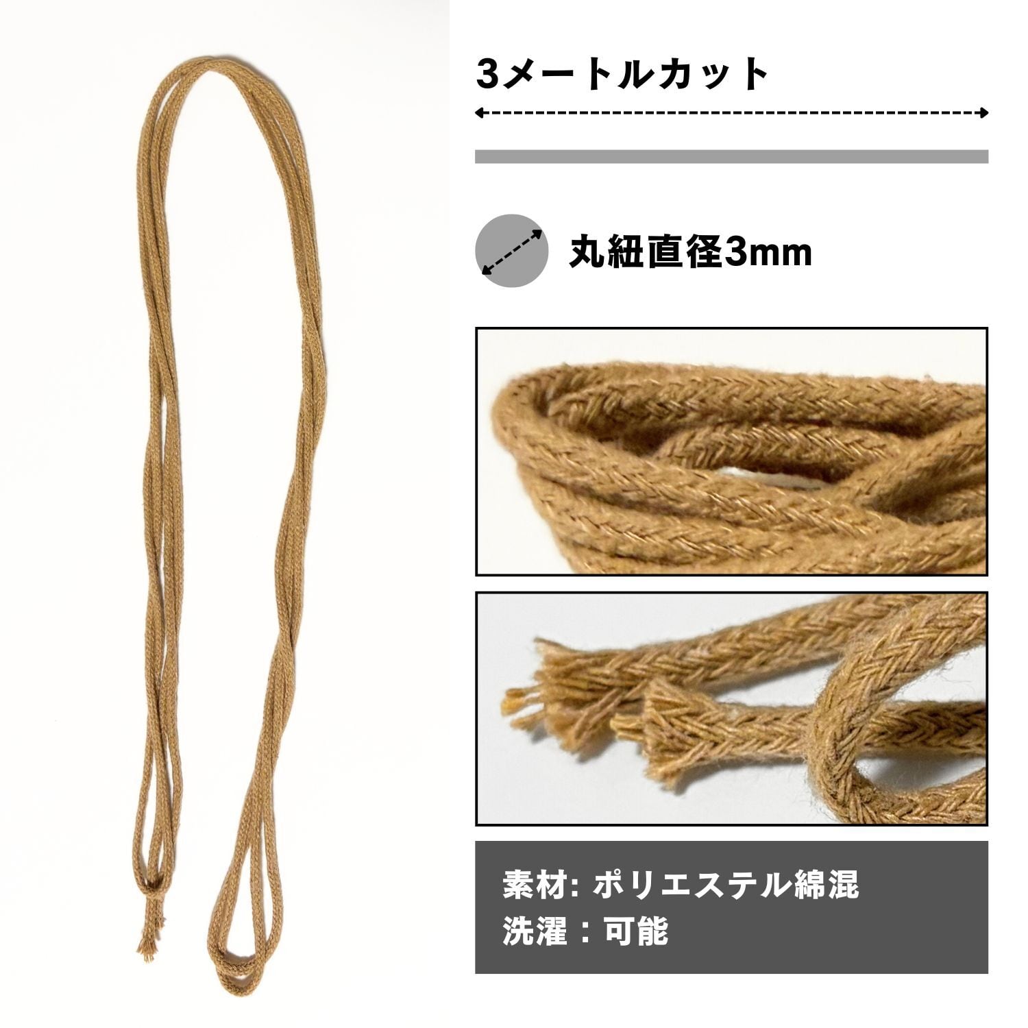 ほつれにくいコアスパン織りのロープですので、端を結んでカットすればほつれの心配はなく簡単にご利用いただけます。