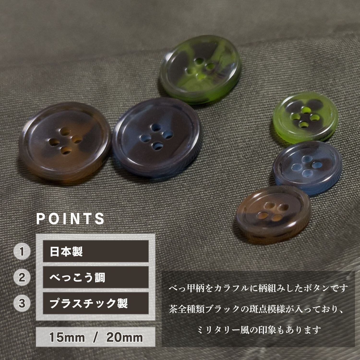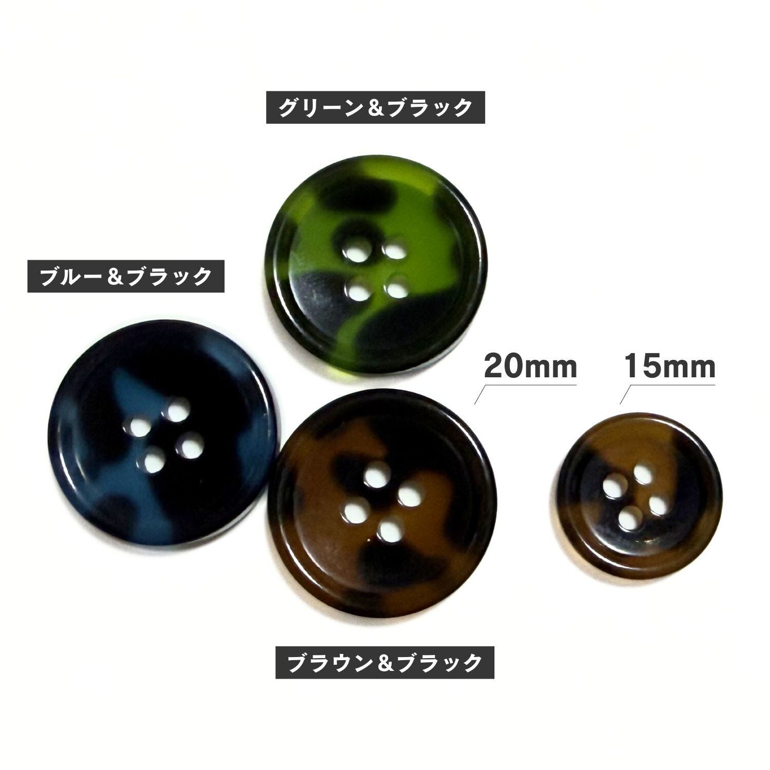 縁ありの4つ穴ボタンで、15mm,20mm の2サイズ展開。