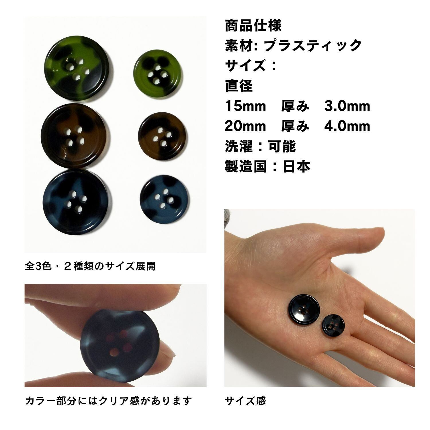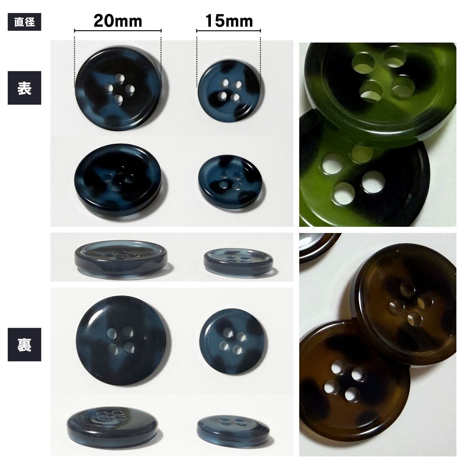 縁ありの4つ穴ボタンで、15mm,20mm の2サイズ展開。